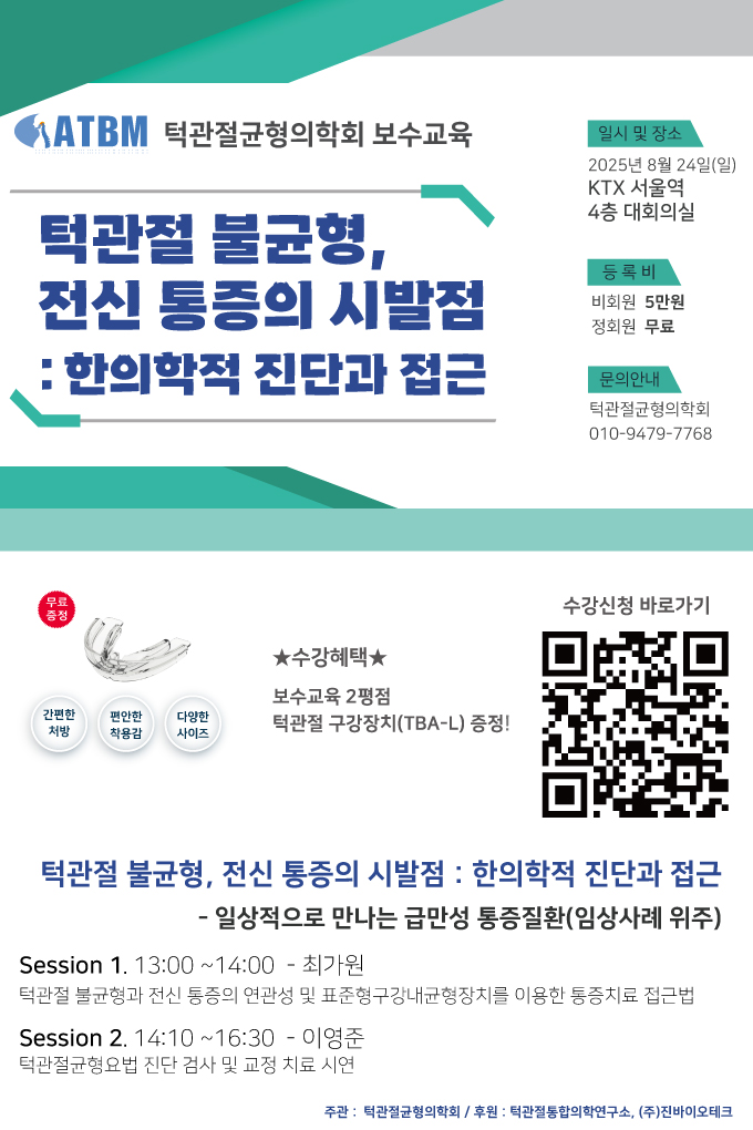 25년 8월 24일 일요일에 전신 통증의 시작점인 턱관절에 대한 보수교육이 예정되어 있습니다. 턱관절은 몸 전체에 영향을 미치는 중요한 부위 중 하나로, 적절한 관리와 이해가 필요합니다.